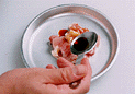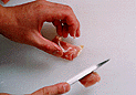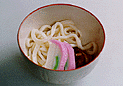 | 4.生椎茸は、軸を取り除ききれいに洗い水気を拭き取る。 | 5.蒲鉾は左端より3mm厚さにそぎきりにする。 | 6.三つ葉は、根を切り落とし1,5cmm長さに切る。 |