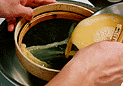 | 7.卵2個を用意する。出しは400cc塩少々、味醂大匙1、薄口醤油大匙1で味付けする。 | 8.卵をときほぐしその中に調味した出しを加える。 | 9.卵生地を裏ごしに通しカラザを取り除く。 |