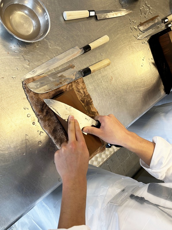 初めて包丁を研ぐ学生たちは特に集中力が必要です。
