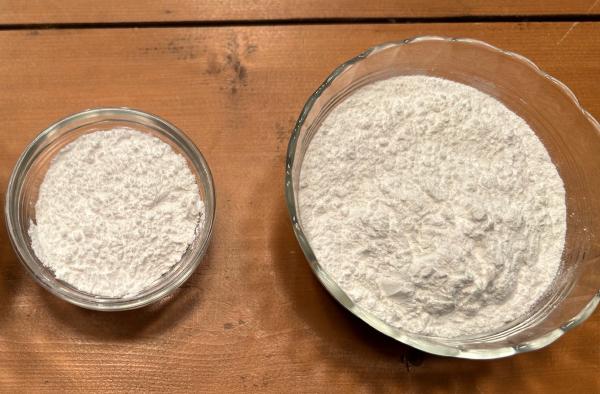 餅生地には、餅粉(右)と、うるち米を粉にした上新粉(左)を少し加えます。