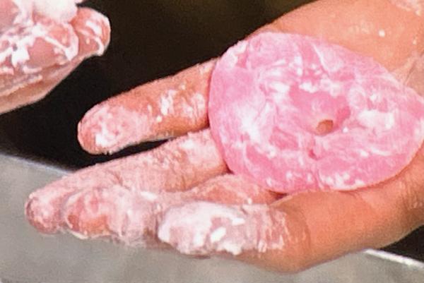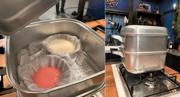 全体が混ざったら、生地の3分の1に赤い色素を加えて、赤と白の生地を蒸し器へ。