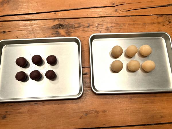 あんは、小豆のこしあん(左)と、白インゲン豆の白あん(右)の2種類を用意します。