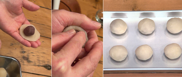 こしあんの色でお餅の色がくすまないように、白あんで包むというひと手間を加えて。