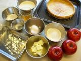 アパレイユとりんごを詰めて焼いたタルトケースが冷めたら、その上にタルト用セルクルをもう1つのせて重ねるか4cm高さになるようにフィルム(硬いもの)を巻きつけ、でき上がったクレーム・シブーストを流し込む。