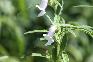 こちらが胡麻の花。実を割ってみると、つぶつぶがみえます。