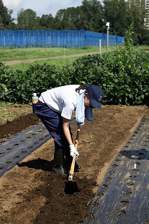まず、鍬で、種を植えたビニールの両脇を掘っていきます。