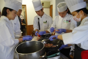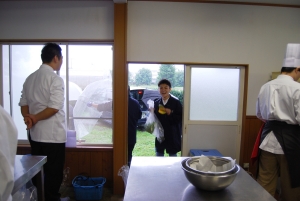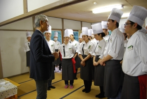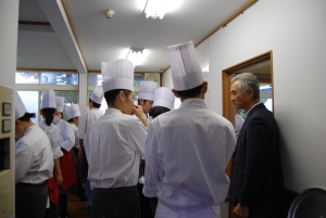 厨房では学生に激励の言葉をかけたり、食事後は1品1品料理の評価を行い、それを真剣に聞き入る学