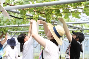 ブドウの袋掛けをしながら、ワインや生食に使われるブドウの特徴の違いや種無しを作るための作業などのレクチャーを受けたり、果物の収穫後は様々な品種を食べ比べて違いを体感するなど、生産現場ならではの学びに本校の学生間では人気の活動となっています。