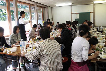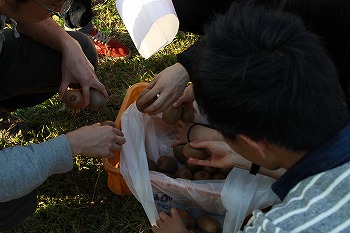 準備も整ったところで、参加者の方々が、芋ほりや見学を終えてもどっていらっしゃいました。