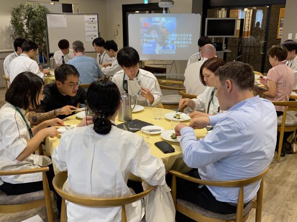 料理が完成したあとは、北欧スタイルでみんなで食事をしました。学生たちは積極的にコミュニケーションを図り、シェフたちとの交流を楽しみました。