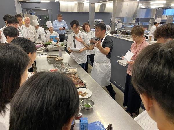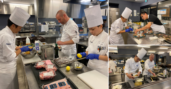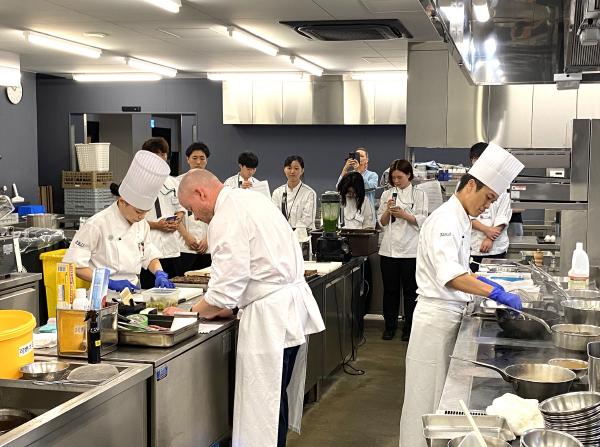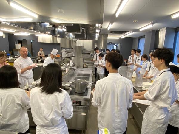 セミナー開始時間より少し早めに集合した学生たちは、実習室に入りたいと切望し、シェフと先生たちが準備している様子を見学し、その所作に興味津々でした。