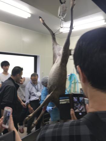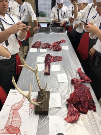 学生たちは事前課題として、「ジビエの概念」「家畜と野生鳥獣類のちがい」「鹿(四つ足の動物)の体の構造と肉の部位名」などを理解した上で講義にのぞみました。