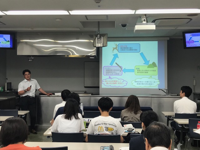 次に、日本ジビエ振興協会理事長 藤木徳彦氏による「国産ジビエの利活用」、続いてこの上級編に新たに追加された「食肉処理施設の取り組み」について、国産ジビエ認証処理施設である信州富士見高原ファーム 戸井口裕貴氏による講義がありました。