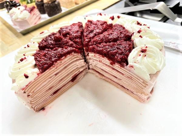 いちごのミルクレープを考案した班は、最後まで根気強く丁寧に取り組んでいました。前回は、風味が少し単調に感じられたため、ベリーのピューレを追加して、酸味と香りのアクセントをつけていました。外見もデコレーションを工夫して華やかになりました。カットした断面が圧巻です。カットするときは、他の班の学生も見に来て、断面が現れると「おおっ」と歓声が上がっていました。