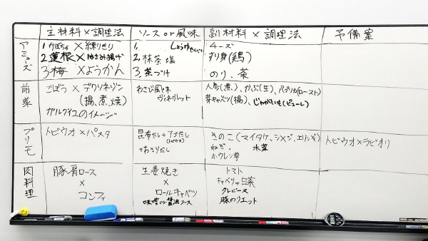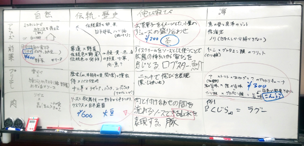 さらに、コース料理を「つきだし」、「前菜」、「一品目」、「(二品目の)肉料理」で構成すると決め、それぞれの担当者がこのテーマを料理でどのように表現するのかを考え、書き出して共有しました。