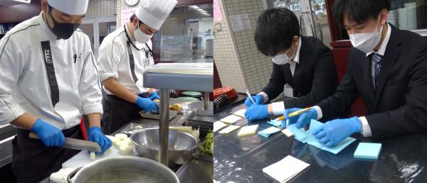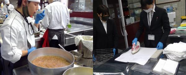 当日は、料理作りだけではなく、料理の説明や提供など、お客様へのサービスもありますので、料理の仕込みや味の確認はもちろん、テーブルを飾るナプキンのアイロンがけもあれば、料理を提供するための様々な事前準備が必要となりますが、どれも学生たちが主体的に進めています。