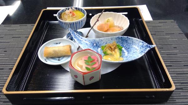 先付八寸は「季節のうつろい」と題して、この試作では、右上から左側へ反時計回りに食べると、冬から春への「うつろい」を感じられる趣向としました。