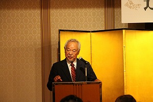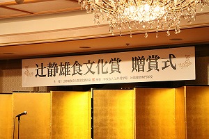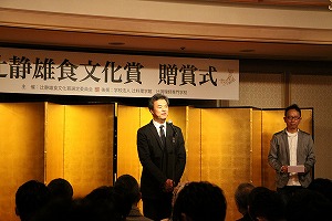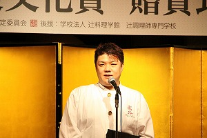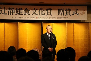 石原氏からは、生前、お店にきた辻静雄から出汁を何回もやり直しをさせられたエピソードが披露されました。しかし、それは「生命ある食材を、どう生かしていくか、どうお客様に喜んでもうらおうかと、最後まで使い切ってこそ、美味しくお客さんに喜んでいただいてこそ、我々の仕事を真っ当できるのではないか、そういうことを教えていただいたのではないかと思います。(受賞は)そういう心に光をあてていただいたということが一番うれしかったですね。今までずっと長い間、黒子でしたらから。昨年こういう賞をいただいて僕にとっては勲章になります。みなさん、受賞おめでとうございます。」と話されました。