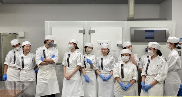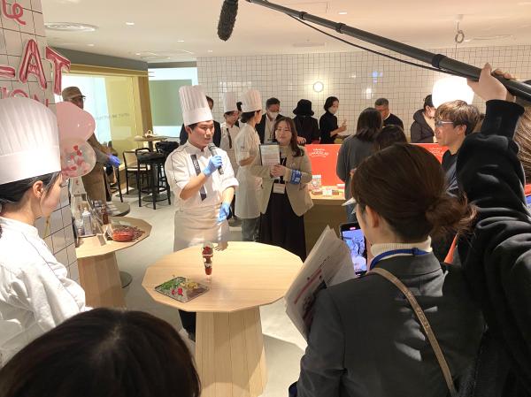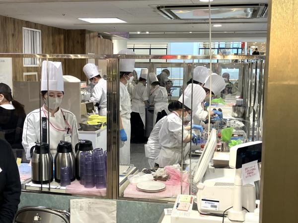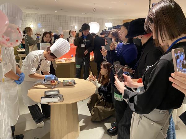 1月9日には、あべのハルカス近鉄本店にて、メディアやインフルエンサーさんを対象とした内覧会が行われ、学生も参加させていただきました。多くのカメラの前でパフェの盛付けデモンストレーションを行い、ここでも様々な取材を受けました。