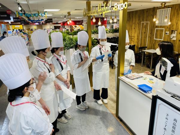「チョコパフェ博覧会」では "花束" をテーマに、各ブランドから全12種類のチョコレートパフェが登場するなか、本校の製菓技術マネジメント学科2年生も参加。放課後の時間を使って数ヶ月間試行錯誤を繰り返し、2種類のオリジナルパフェを完成させました。
