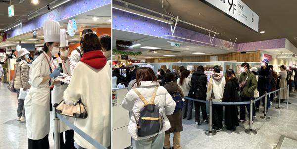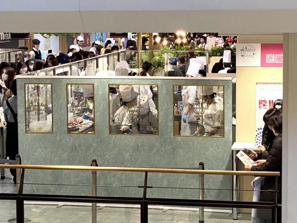 百貨店の開店と同時に、整理券を求めて多くのお客様が並んでくださり、予想以上の雰囲気に学生たちにも一段気合が入った様子。接客チームはお待ちいただいているお客様にパフェのコンセプトなどを説明し、コミュニケーションをとっていました。