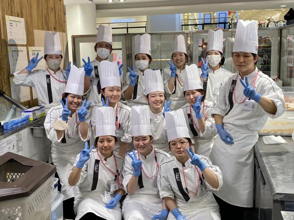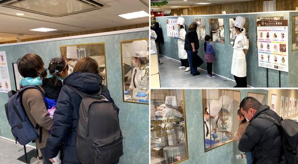 閉店が近くなりお客様の列がなくなると、代わって小さなお子様たちが学生の様子を覗きに来てくれることも。将来はパティシエを目指してくれるといいですね~