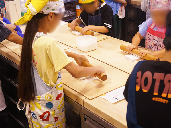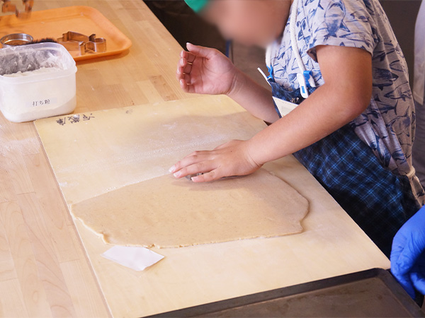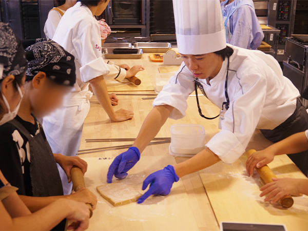 生地を伸ばす時は先生と学生が丁寧に力のかけ方やコツを教えました。