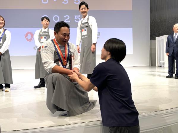511名が参加した今回の「RED Ū-35 2025」の頂点に輝いた須藤良隆シェフは本校の卒業生です。最終審査でアシスタントを務めた学生とも熱い握手をしてくださいました。