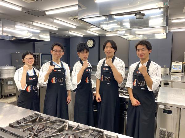 今回、シェフの調理アシスタントを務めた5名の学生たち。大会公式のエプロンを着用し、貴重な機会に緊張しつつもやる気満々です。