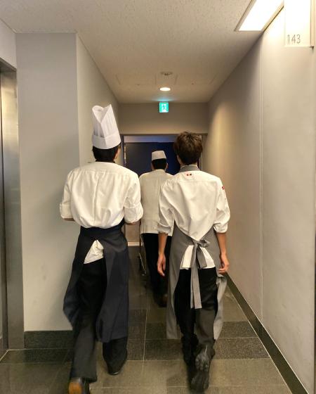 時間差で次々と調理がスタートしていくなか、周りのスタッフさんから激励の声をいただきながらシェフと一緒に調理場に向かう学生の後ろ姿。本当によい経験をさせていただきました。