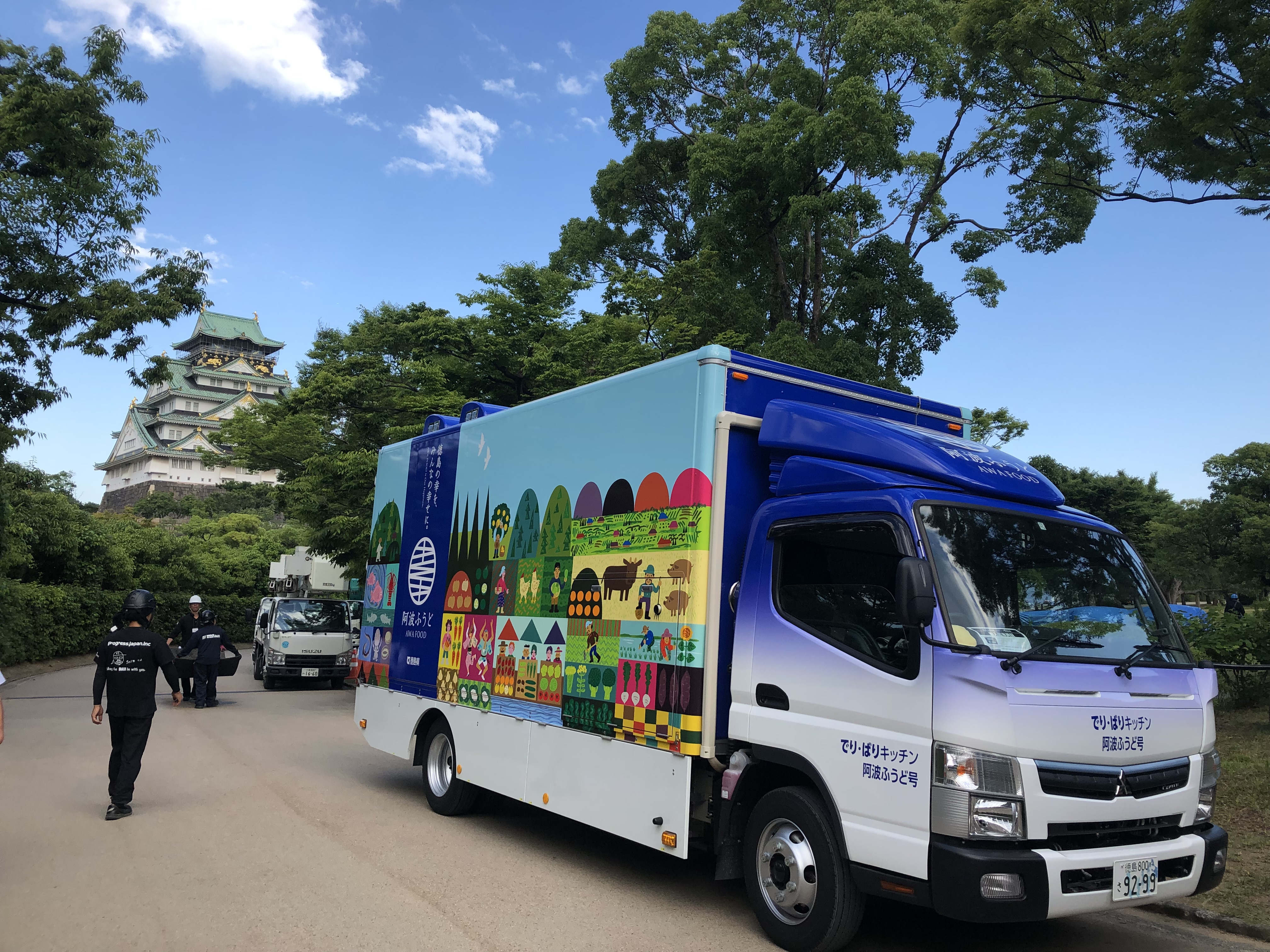 迎賓館にある既存の厨房施設に隣接する仮厨房を設置し、あらゆる製造ラインを分けました。さらにその隣には移動調理施設、つまり「キッチンカー」をおきました。一般的にキッチンカーは調理能力は高くなく、空調能力も低いといわれています。そこで、徳島県が持つ3tのキッチンカーに白羽の矢を立てました。なんと5名のスタッフが同時に中で調理することができ、業務用のスチームコンべクションオーブンも設置されています。![]()