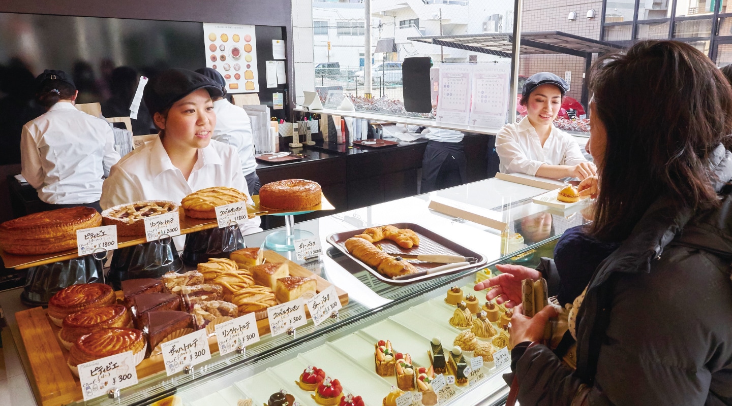 訪れたお客様に製造の様子を対面で見てもらい、パティスリーやベーカリーでの一連の仕事を学びます。