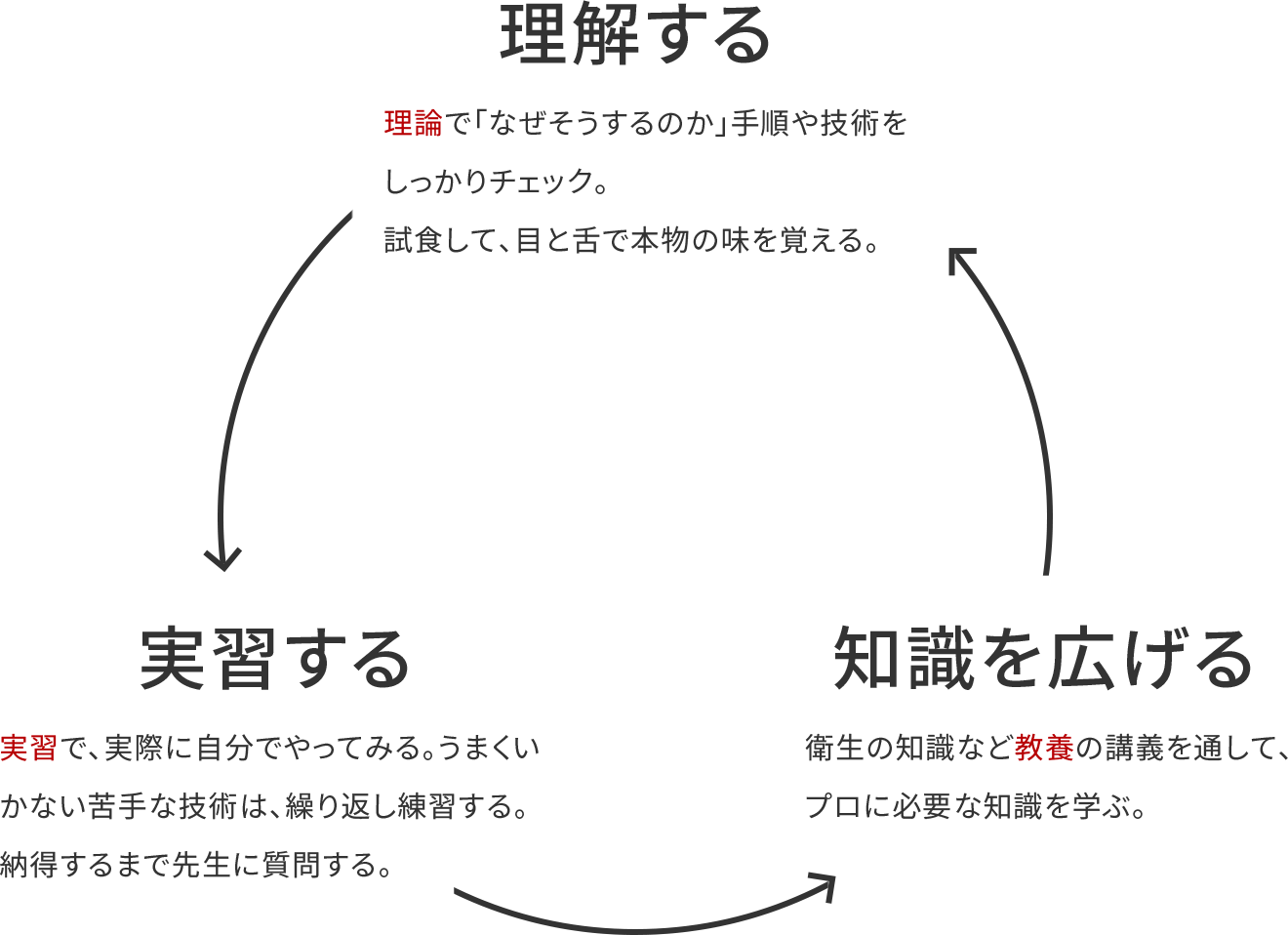 辻調では「講義」「講習」「実習」の授業を効果的にリンクさせる独自の学び方を展開。