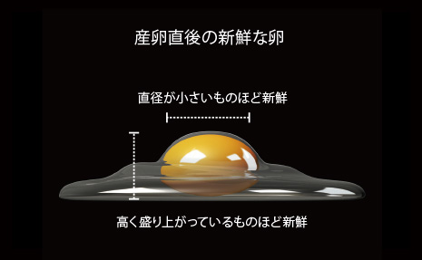鮮度を見分けるには、平らなガラスの上に卵を割り落とし、その形状を調べます。水様卵白が少なく卵白があまり広がらないもの、卵黄がよく盛り上がり、直径が小さいものが新鮮卵と見分けられます。血液を含む、いわゆる血玉に商品価値はありませんが、血液が少量のものは食べるのに問題ありません。
