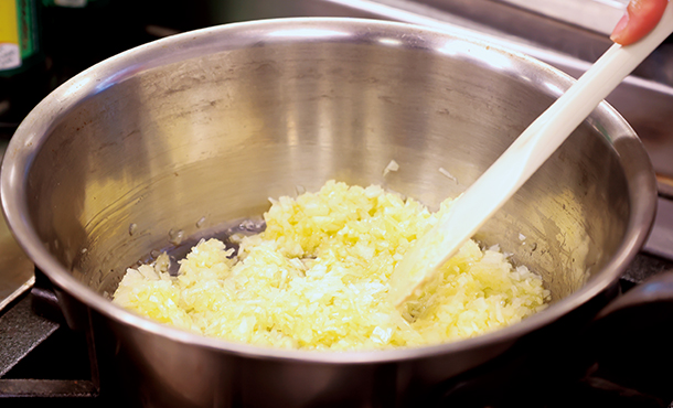 いよいよ先生の実演!ベースの玉ねぎ炒めから。