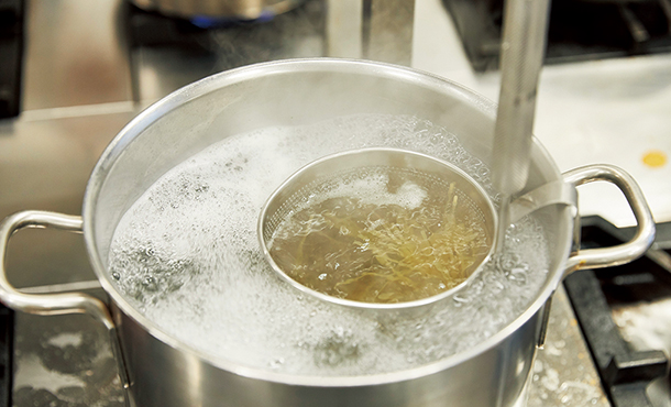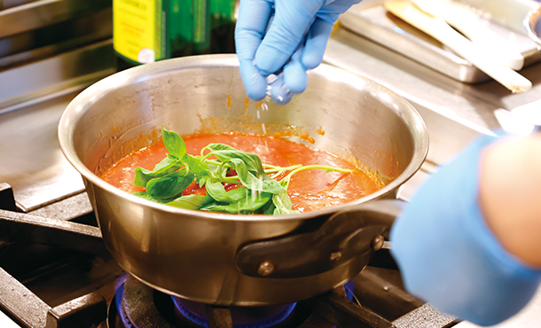 トマトの酸味のキレが素材の持ち味を活かすソースなので、煮詰め過ぎないように。2/3の量になるまで煮詰めたら、香りづけのバジリコと、うま味を引き出す塩を加えます。