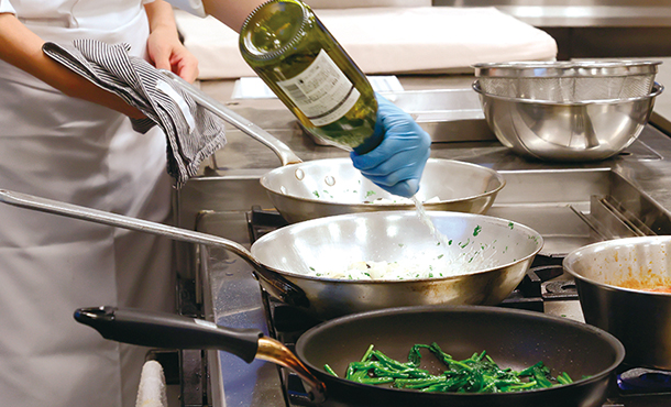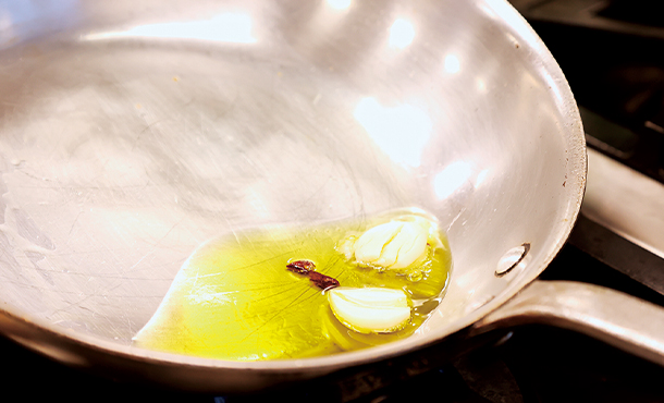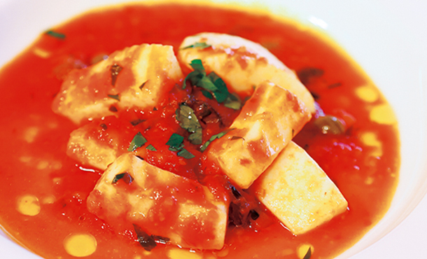 赤唐辛子とにんにくの香りを引き出したオリーブ油でイカを炒め、パセリや黒オリーブを加えた後、トマトソースで煮ます。イカの食感を損なわないよう、火通しの加減がポイント。