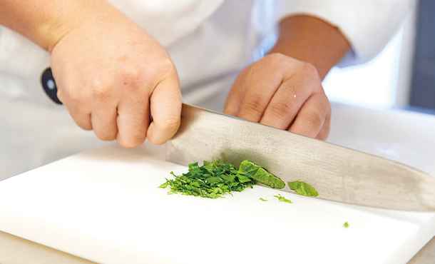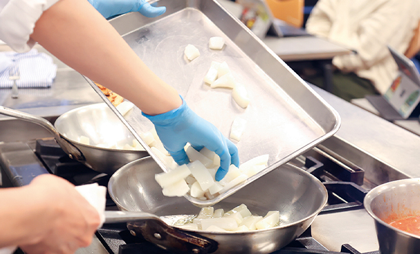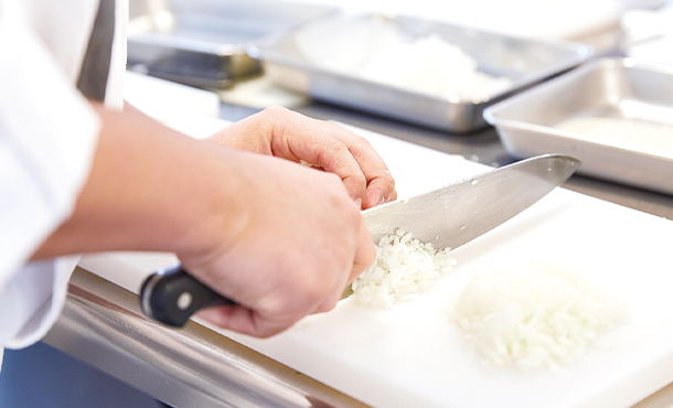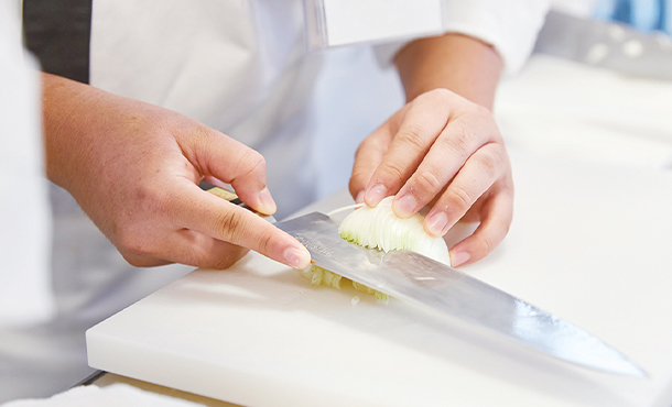 これまでの実習でも何回か取り組んできた玉ねぎのみじん切り。こうして反復練習を重ねることで上達を実感できます。でも先生のお手本と比べると、まだまだ練習が必要かも!