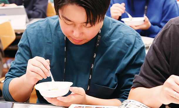 完成した料理を全員で試食。この味が基準になっていく。