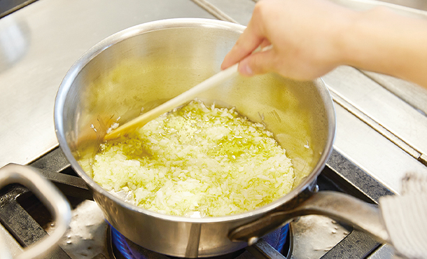 玉ねぎとにんにくのみじん切りをオリーブ油で炒めたものがトマトソースのベースに。やや多めの油で「揚げる」感覚で、焦がさないようじっくりと、薄く色づくまで炒めます。