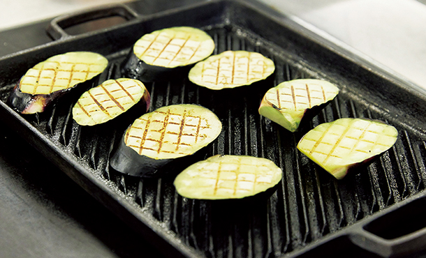 ズッキーニ、なす、エリンギ茸をカットしてオリーブ油をまぶし、グリル板で表面に焼き目をつけます。自分の担当料理の下準備が済んだら、他の料理の進捗確認やお手伝いも。