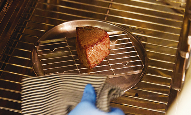 牛肉はまず強火で手早く表面を焼いて(中まで火が通り過ぎないように!)旨味を閉じ込め、その後オーブンでじっくり加熱。試作で火の通り具合を確かめ、午後からの本番に備えます。