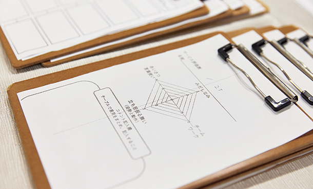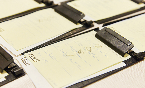 テーブルごとのコース料理の進行状況は、オーダーシートを使って常に全員で共有!