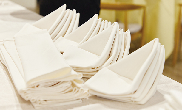 綺麗に磨いたグラス、ナプキン、お皿などを、「平行」「直角」「シンメトリー」といった美しい位置関係に注意しながらセッティング。お客様をお迎えする準備が、いよいよ整いました!