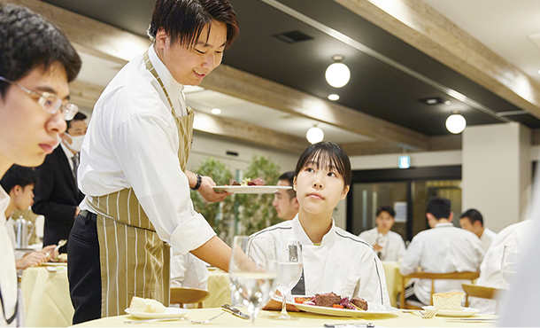 こういうことは、実際に料理を運ぶサービスの役割を体験しないと気づけません。料理とサービスの両方を、しかもプロの現場を想定した実践を通して学ぶことで、たくさんの気づきや発見を得ています。