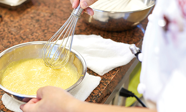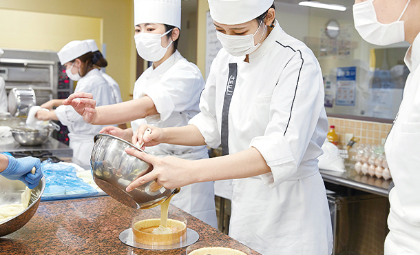 これまでの授業では基本となる⽣地を使ったシンプルなお菓⼦の学習が中⼼でしたが、今回からは⼯程も味も少しずつ複雑になっていきます。