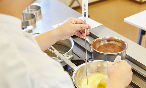 アングレーズソースが仕上がったらゼラチンを加えて急冷。このアングレーズソースとメレンゲ、⽣クリーム、3つの温度をそれぞれ測り、合わせた時に最適な温度になるよう調整し状態をチェック!