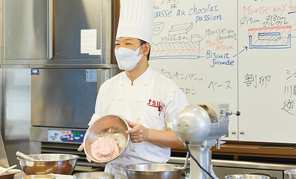 ムースの製法についてポイントや注意点をふまえて確実に⾝につけることが最重要テーマ。「どんな材料で?」「各材料の役割は?」「混ぜる割合は?」など、しっかり学び取ります!