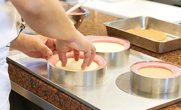 ⾚いフルーツのピュレをベースとしたムースも作製。焼いた⽣地をカットして型に⼊れて⼟台をつくり、そこにムースを流し込んでから冷凍しておいたバヴァロワを⼊れ、さらにムースを流し込んで冷凍庫へ!