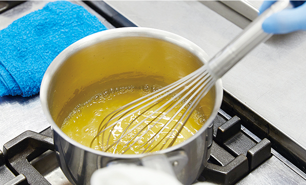 鍋でオレンジのアングレーズソースをつくり、機械でメレンゲを泡⽴てます。「メレンゲは⽴て過ぎると硬くなってムースの⼝溶けが損なわれる」という点に気をつけて!